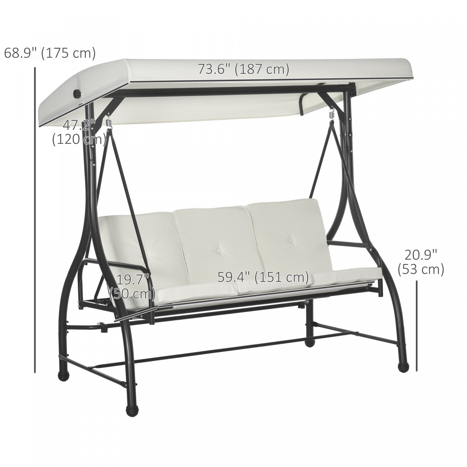 | Additional Information | ● Colour: Cream White and Black ● Material: Steel, Polyester Fabric, Breathable Mesh ● Overall Dimension: 76.75"L x 46"W x 69"H ● Seat Size: 41.75"W x 19.75"D ● Cushion Size: 40.25"L x 19.75"W x 2.75"T ● Canopy Size: 74.5"L x 46.25"W ● Bed Size:57"L x 41"W ● Seat to Floor Height: 18" H ● Weight Capacity: 528lbs ● Item Label: 84A-031V01CW  |