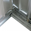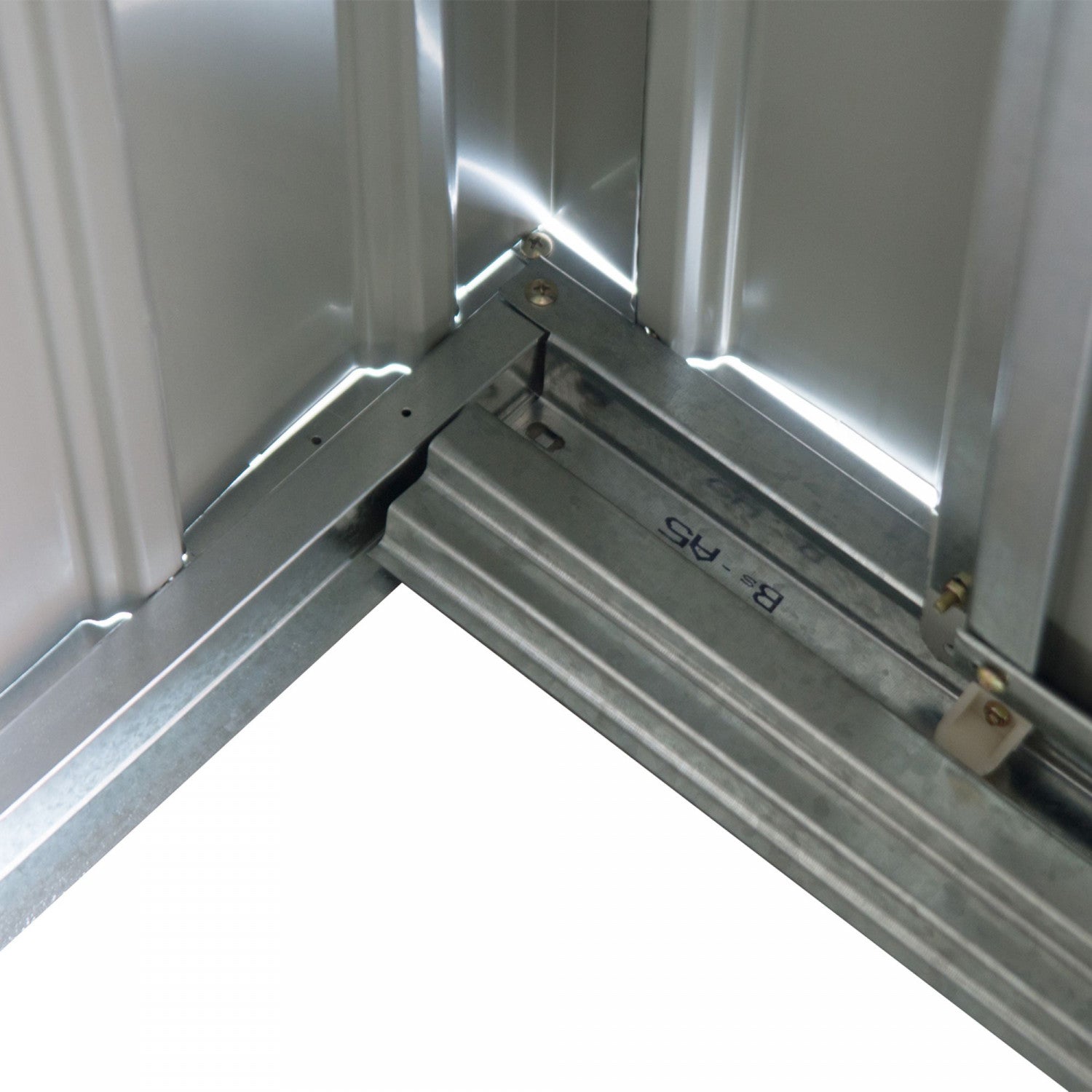 | Key Features | ● Ample storage space for garden tools, lawn care equipment, supplies and more ● Heavy duty construction with reinforced ridged walls and a sturdy steel foundation ● Built with the finest galvanized steel and durable polypropylene construction ● Sloped roof prevents moisture and resists bad weather ● Double sliding doors for easy access and saves space for more storage ● 4 vents for increased lighting and airflow ● Maintenance free and corrosion resistance ● Assembly required |
