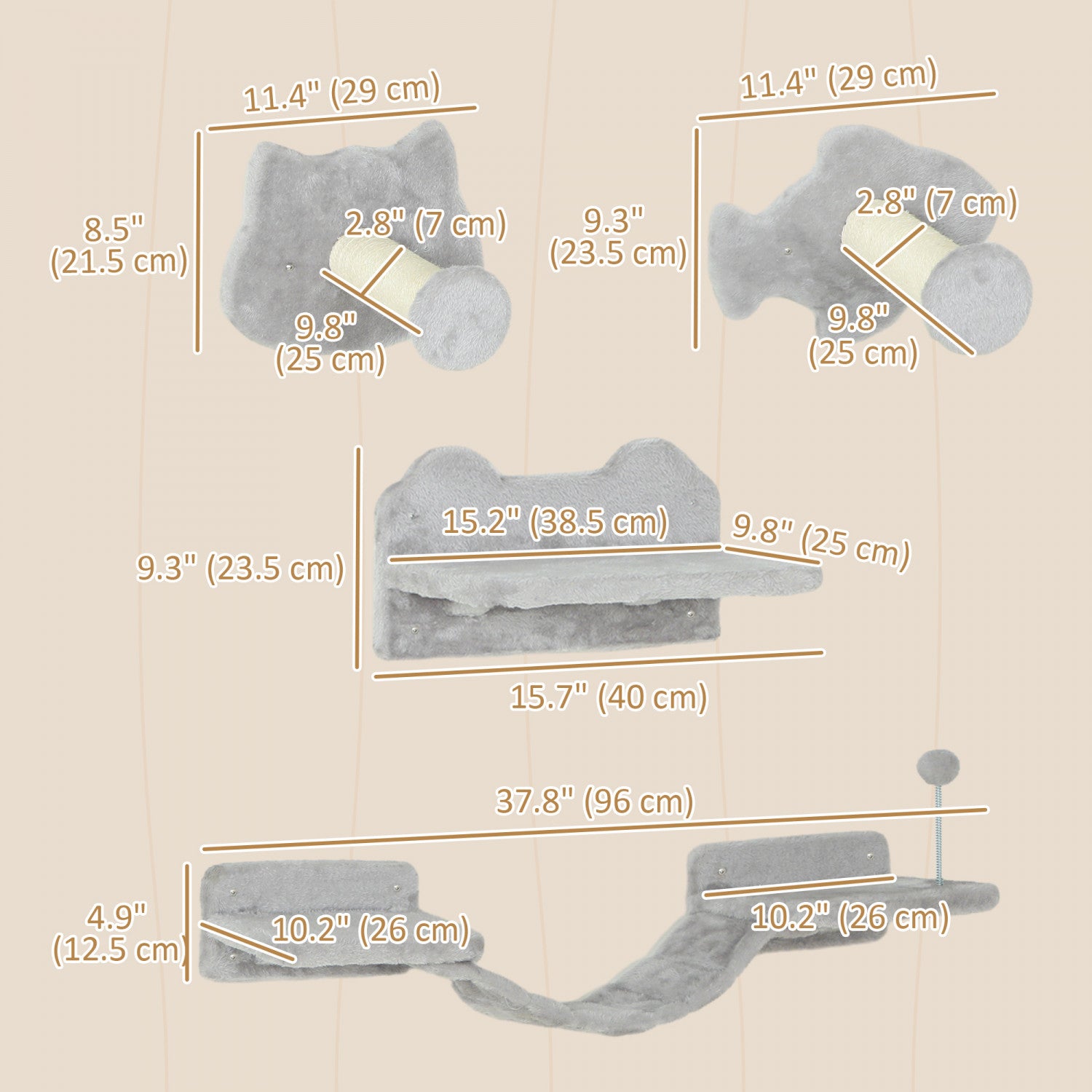| Key Features | ● 4-piece set offers variety in design for playful cats ● Wall-mounted design, satisfy their desire to higher place ● Made of particleboard for long-lasting strength ● Scratching posts save your furniture ● Free from the disturbance of other pets ● Goes well easily with your home's existing decors ● Assembly required |