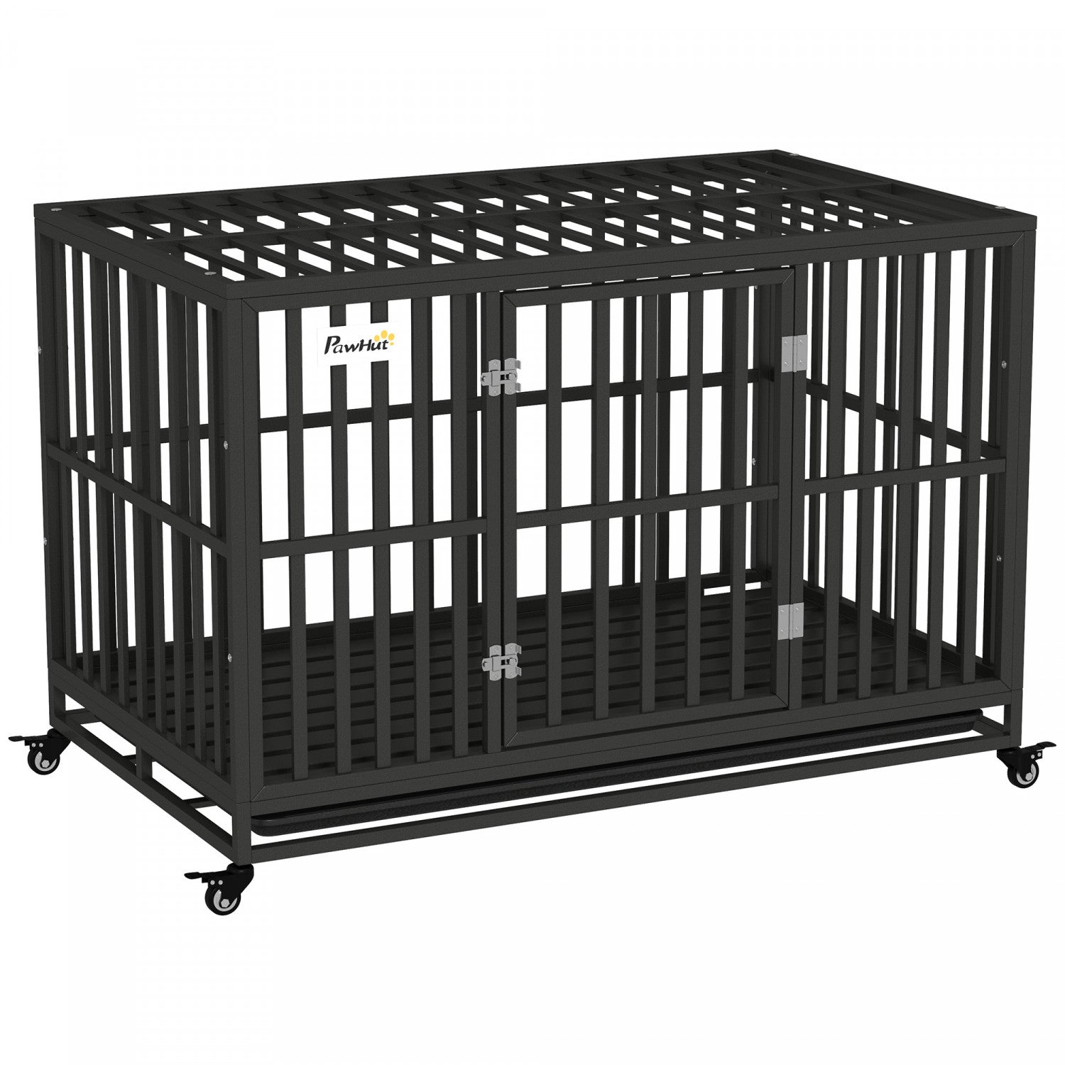 Pawhut Heavy Duty Steel Dog Crate Kennel Pet Cage With Wheels For Portability And A Door For Convenient Access Anti-pinching Floor, 49.2"l X 29.5"w X 34.6"h, Black