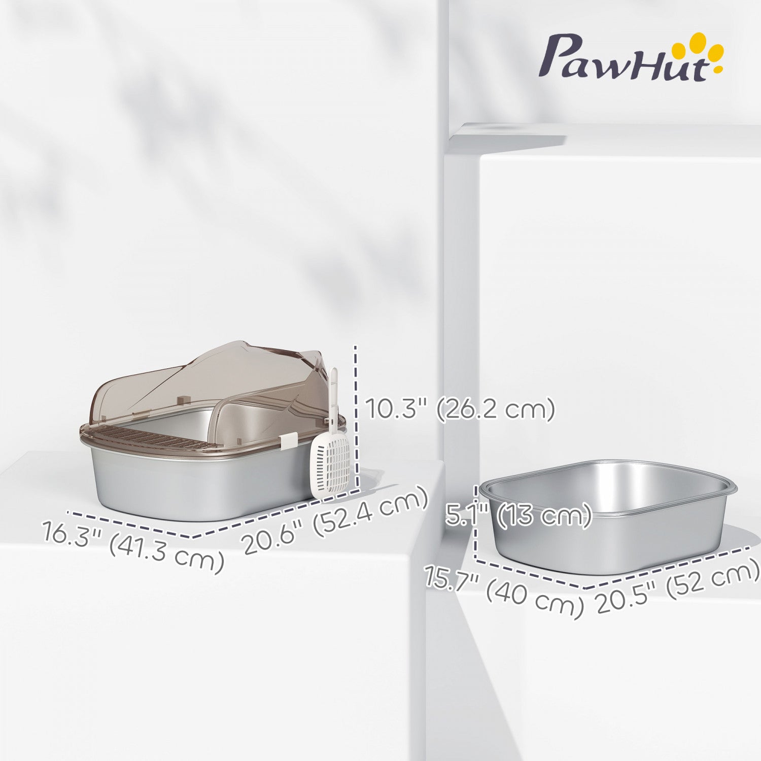 Pawhut Stainless Steel Cat Litter Box With Lid, Metal Kitty Litter Pan Tray With High Sided Enclosure, Steps & Scoop, Non-sticky & Anti-urine Leakage, Easy Cleaning