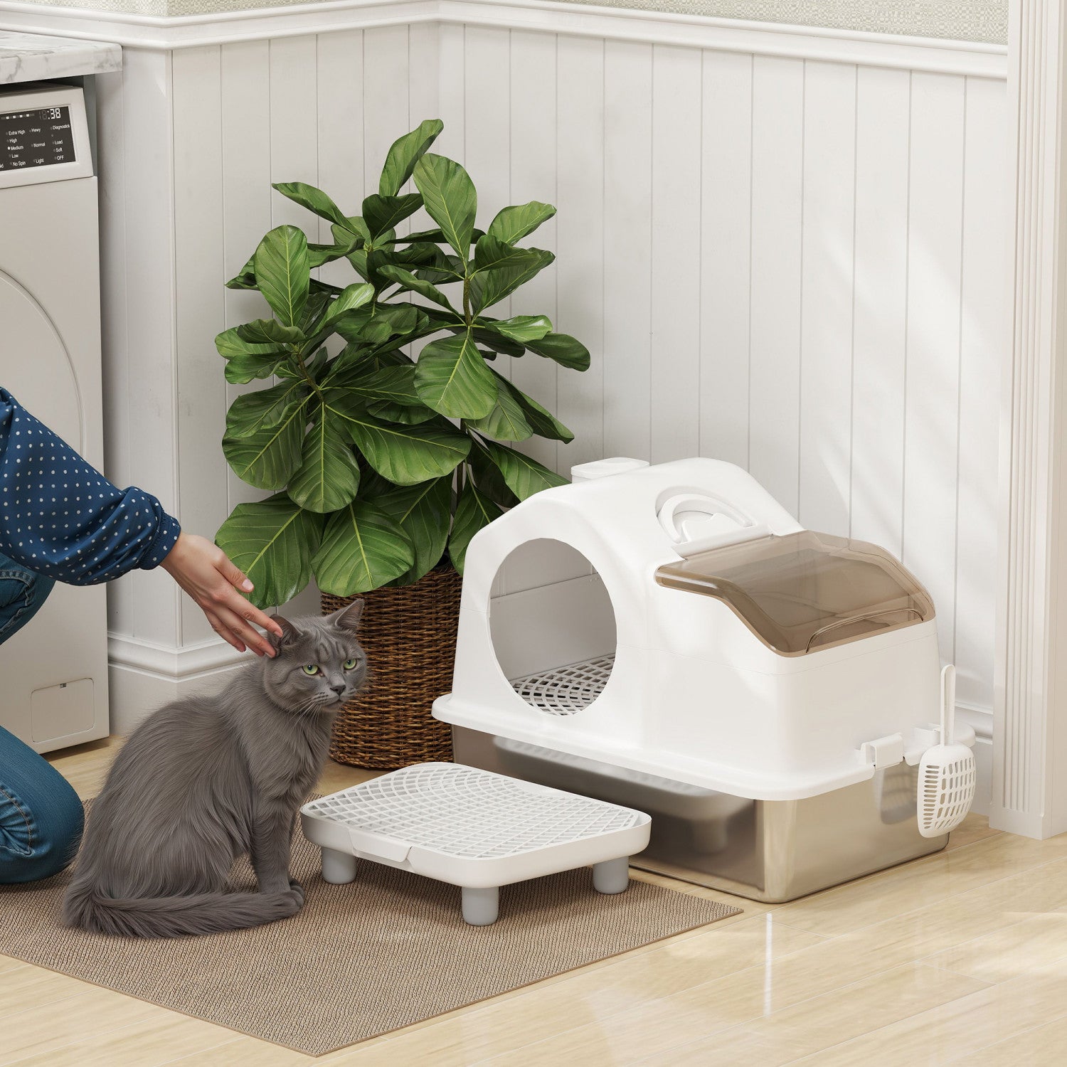 Pawhut Stainless Steel Cat Litter Box With Removable Lid, Extra Large Enclosed Litter Box With High Sided, Mats, Scoop, Odor Free, Non-sticky, Anti-leakage, Easy Clean, For Big Cat