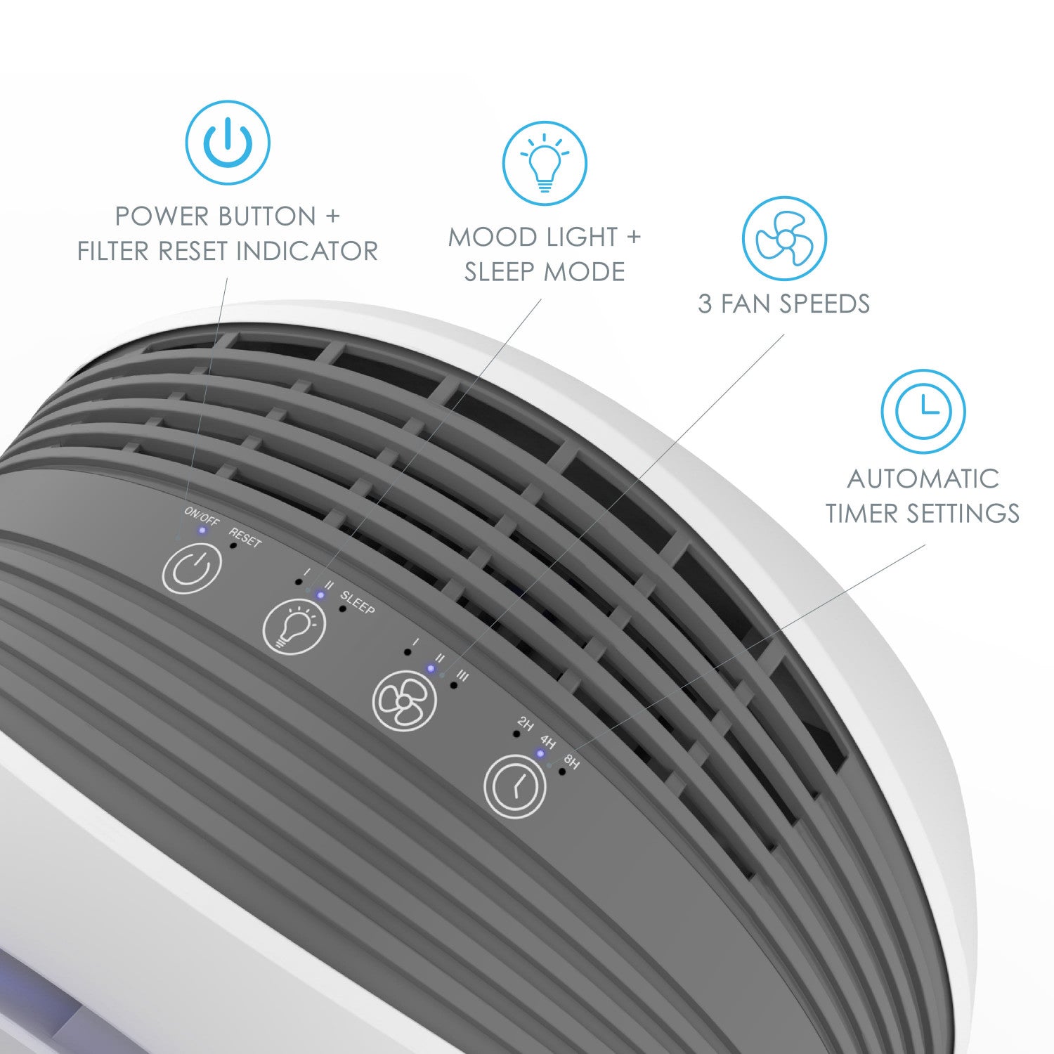 Enjoy cleaner air in your personal space with the PureZone Halo True HEPA Air Purifier from Pure Enrichment. The sleek, modern design fits on any desk, nightstand, or tabletop while beautifully complementing your décor. Featuring a coverage area up to 100 square feet, it’s ideal to use in a dorm room, office, or small bedroom. The filters effectively eliminate 99.97% of particles as small as 0.3 microns–making the air odor and dust-free for people with allergies or breathing issues. The auto-timer shuts off the unit after 2, 4, or 8 hours of continuous operation to conserve energy and extend the life of the air filter. It features two soothing levels of a soft glow night light and a Sleep Mode to turn off the night light and all control panel lights (except the Sleep Mode light). The intuitive control panel includes responsive push buttons that let you determine fan speed, air treatment time, and more. PureZone Halo is backed by Pure Enrichment’s industry-leading 5-Year Warranty so your satisfaction is 100% guaranteed.