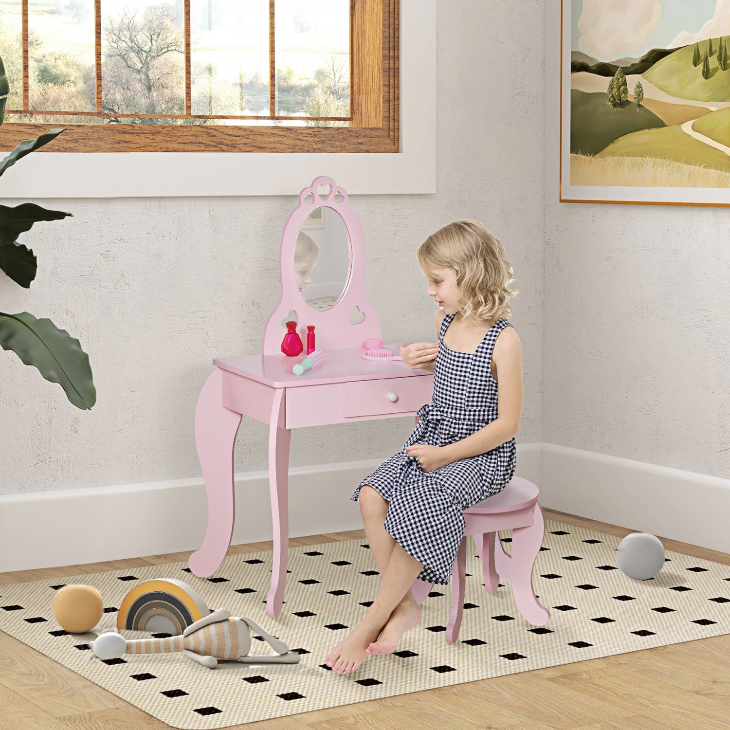 Qaba Kids Dressing Table Set, Vanity Table With Mirror And Stool, Princess Design Makeup Vanity Set With Storage Drawer, Gift For Girls 3-6 Years, Pink