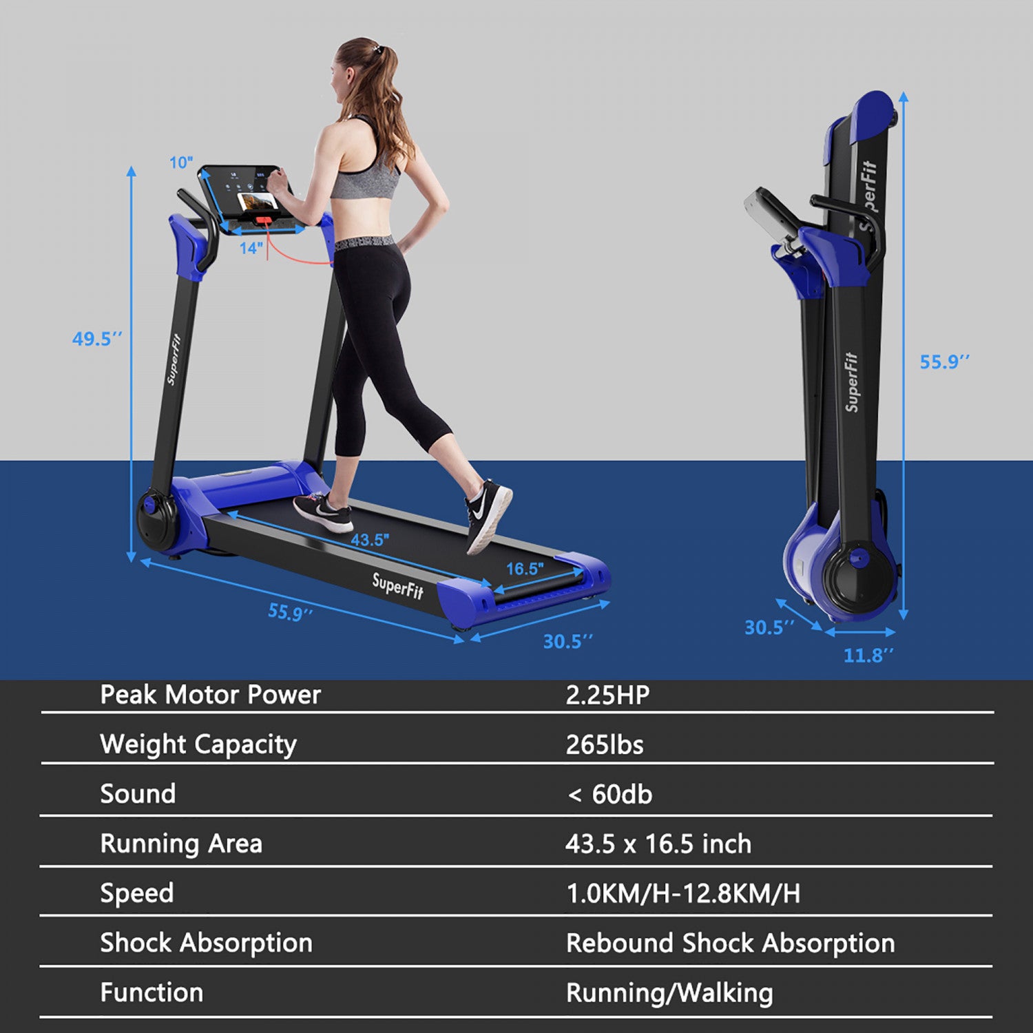 | Additional Information | Color: Navy Material: Metal Overall Dimension: 55.9" x 30.5" x 49.5" (L x W x H) Folding Dimension:11.8" x 30.5" x 55.9" (L x W x H) Running Area: 43.5'' x 16.5'' Net Weight: 86lbs Speed: 1.0-12.8 km/h Control Method: Touch Button Weight Capacity: 265lbs Voltage: AC 110V 50/60Hz Power: 2.25HP Package includes: 1 x Treadmill 1 x Accessory Bag 1 x User Manual |