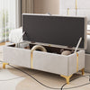 The elegant upholstered storage ottoman combines style, comfort, and functionality. Upholstered in soft velvet, it adds a sophisticated touch to any bedroom or living room. The sturdy metal legs and thick high-resilience sponge provide durable seating while maintaining comfort. With ample internal storage, this ottoman is perfect for organizing pillows, blankets, or magazines. Almost fully assembled, only the legs need installation. Versatile and stylish, it can be used as a bench, coffee table, or storage chest, bringing both practicality and elegance to your home.