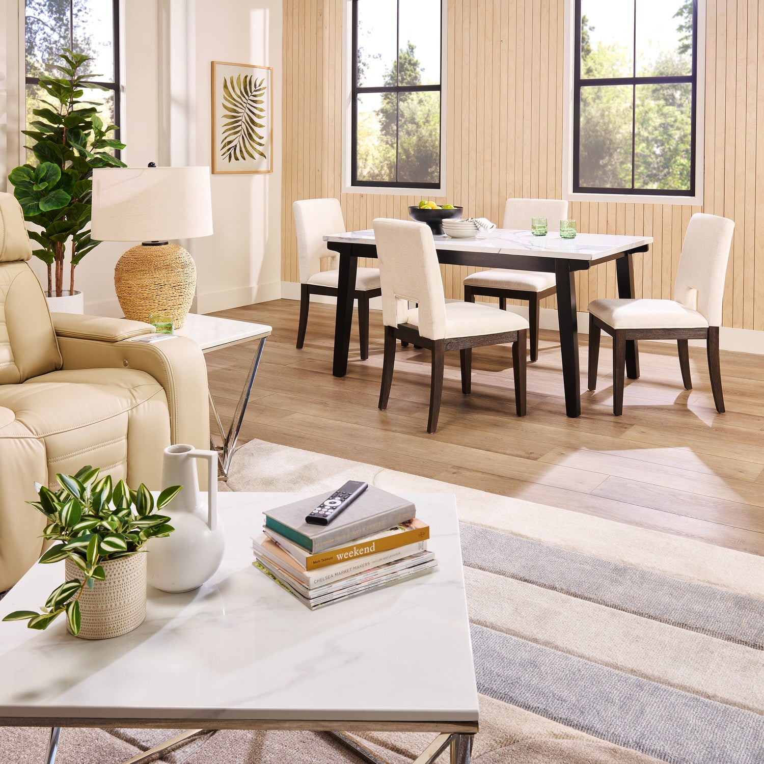 Dine at this fair Verona rectangular table and enjoy the beauty it brings to your home. The squared surface is covered with white cultured marble for a classically modern look. Veined with shades of grey, every tabletop will be unique to your dining space alone. Each of the black wood legs supports a stone slab corner for a visually stunning appearance. Ideal for hosting up to six guests, set the scene with this dramatic dining table.