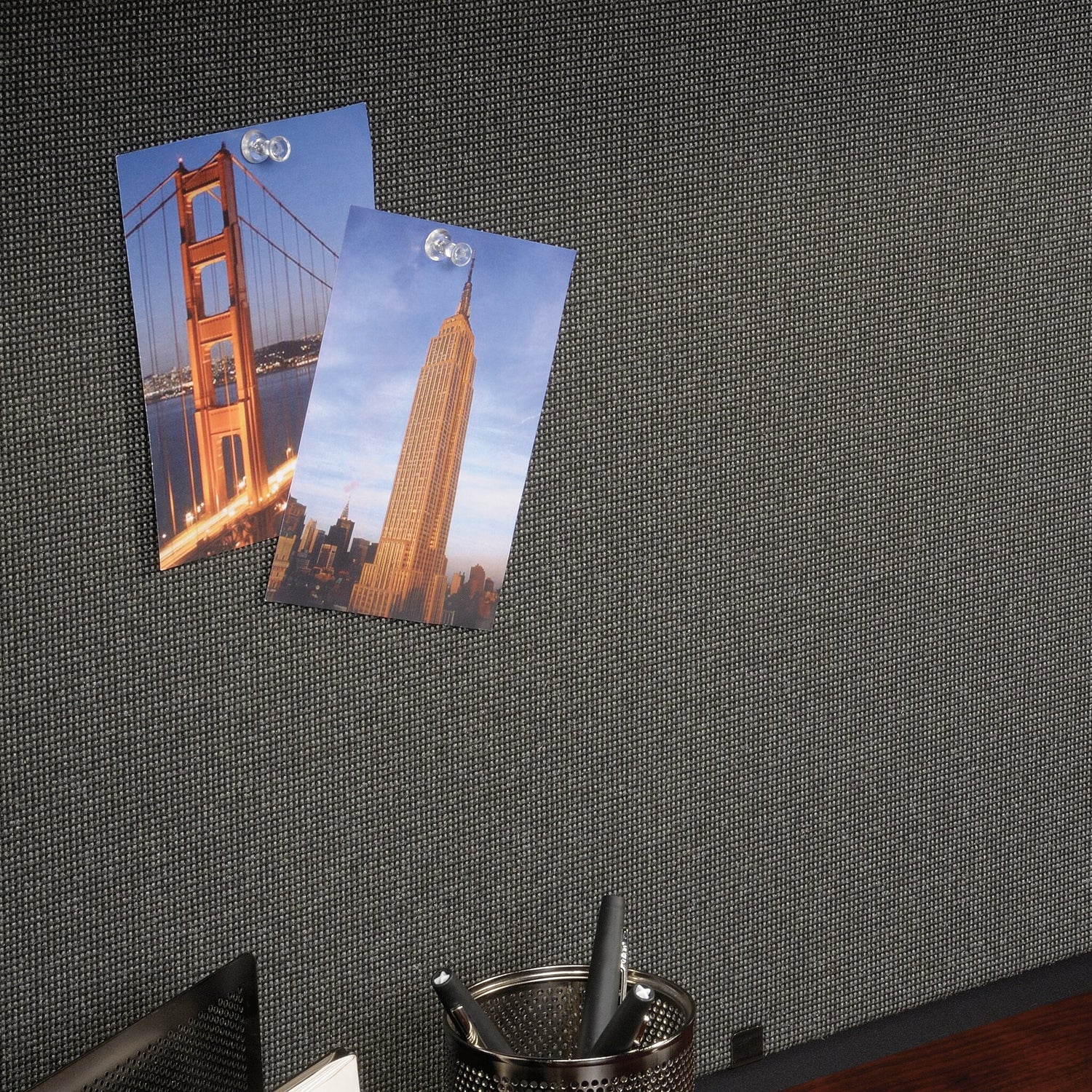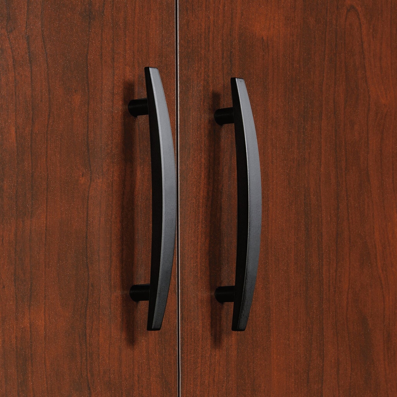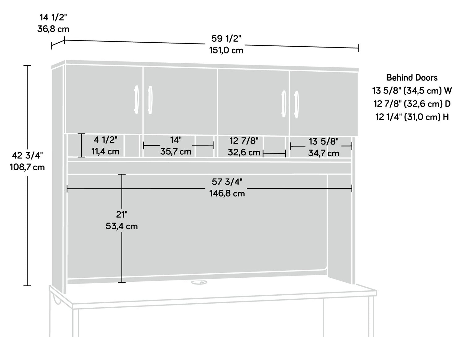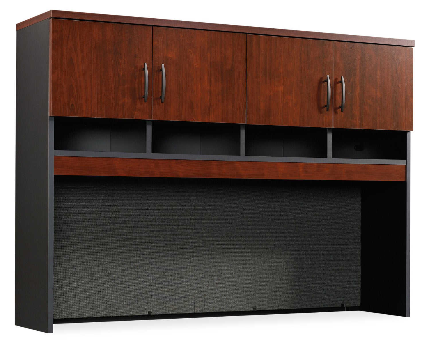 Add a little extra style and a whole lot of extra storage to your office space with this Via hutch. Behind its four doors are hidden storage spaces that provide you with convenient areas to stow away office items that you prefer to be tucked away. It also includes cubbyholes that offer space for smaller office supplies like envelopes and notepads. Plus, the fabric-covered bulletin board makes it easy to hang a calendar, important notes and a few pictures. Finished in classic cherry with a black frame, this hutch will give your space a professional look.