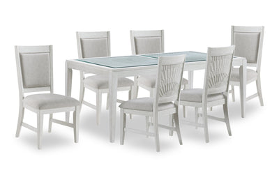 Bring contemporary glam into your kitchen or dining space with this seven-piece Vida dining package. The white finish and geometric patterns under the glass on the table and along the back of the chairs add unique visual interest that will complement any home. The seat cushions and back are 100% polyester, which is durable and easy to clean for a dining space that looks fresh meal after meal. Plus, you can add the Vida server (sold separately) for a complete set. With the Vida, you’ll be dining in style in no time.
