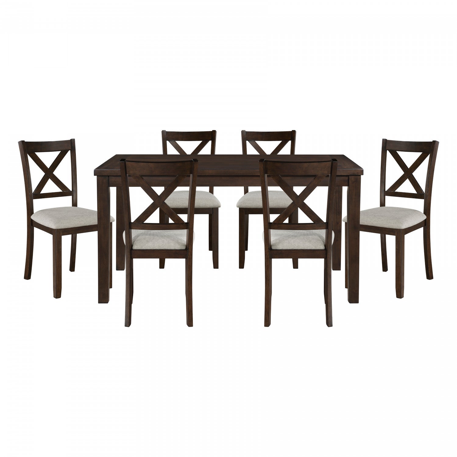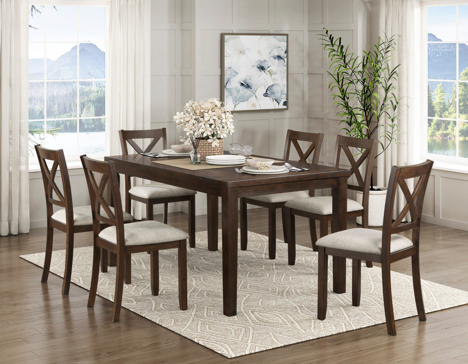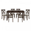 Superbly crafted to meet many needs at once, the styling of the Vintner Collection maximizes decorative flexibility in your home. Transitional accenting makes the Vintner a great option for almost any casual dining setting, while the convenience of having the table and all six chairs packaged in one carton cannot be overstated when it comes time to ship. A dark cherry finish enriches the distinctive graining of the acacia veneers for a look that complements the décor of any room. Padded seats are there for your comfort with contrasting beige upholstery to soften the edges of the X-back chair backs. With effortless style and timeless class, there is something about the Vintner that eludes definition in the best possible way.