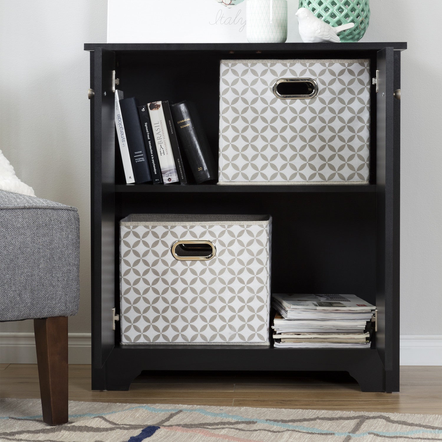 A simple, stylish piece. The simple, elegant design of this two-door cabinet will easily blend in with your decor. The curved cutout at the base, straight lines, and delicate round handles combine style and function beautifully. This piece will be easy to coordinate with the furniture you have in your hallway, living room, family room, or anyplace else in your home. You’re sure to find a place of choice for it! Extra storage this cabinet gives you two storage spaces separated by an adjustable shelf that can hold up to 25 lbs. Put baskets and books in them to unclutter the rest of your furniture – you can keep these items accessible but out of sight! The top surface, meanwhile, can hold a framed picture, a box of tissues, or a small decorative item that’s a reflection of you and will bring out your personality.
