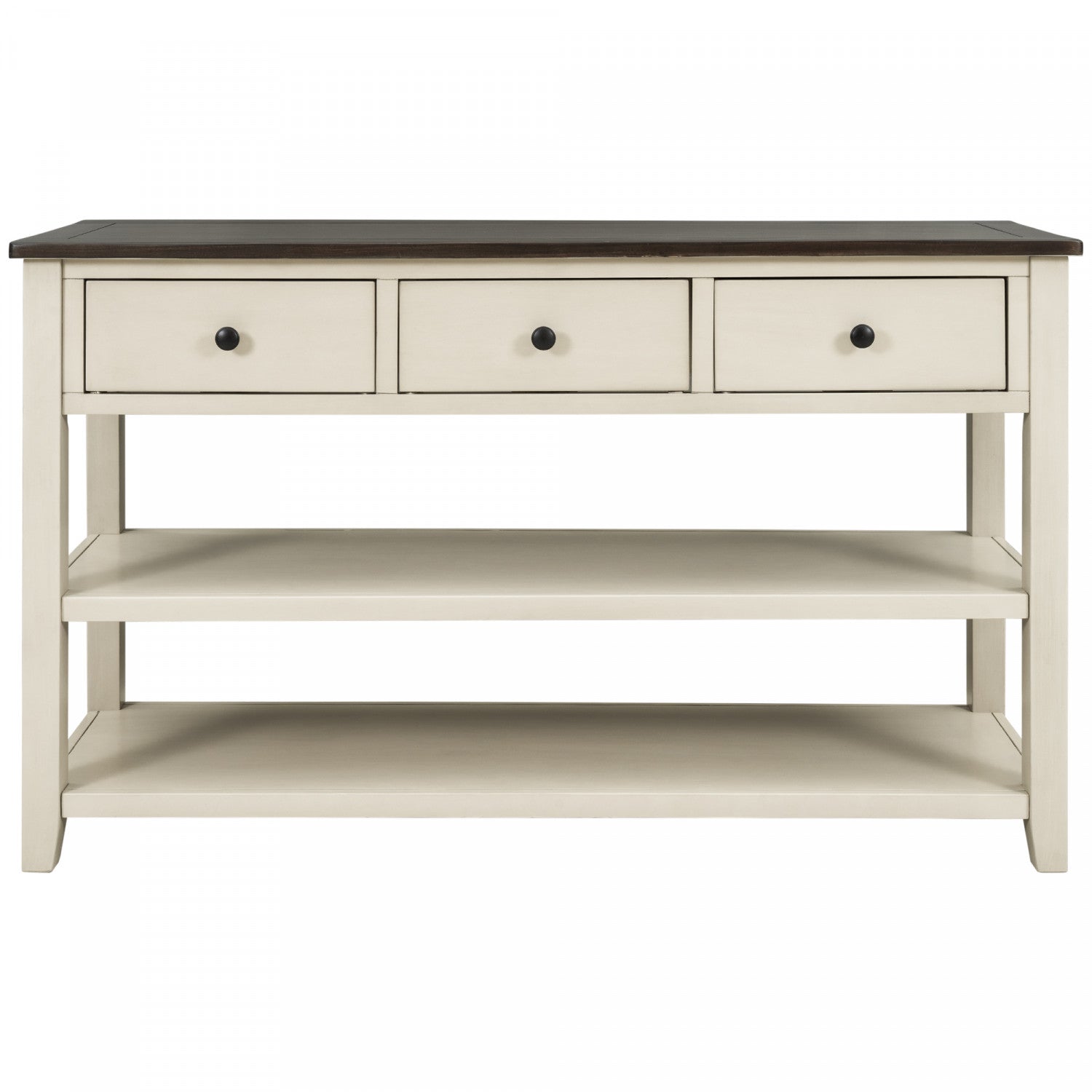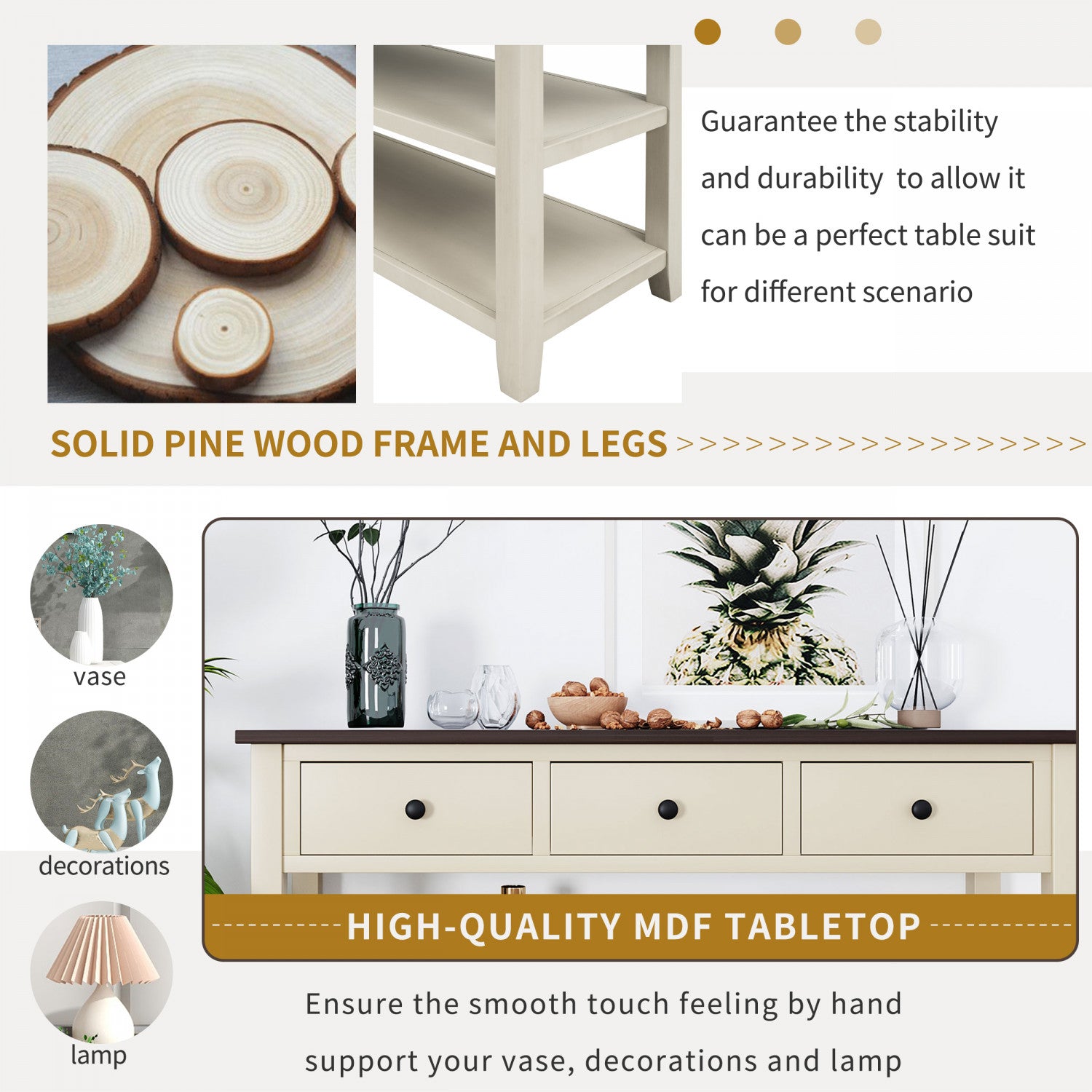 Bring timeless elegance into your living room with this console table. Crafted with a durable pine solid wood frame and smooth engineered wood tabletop, it combines mid-century charm with modern practicality. The three drawers keep everyday essentials neatly tucked away, while two spacious open shelves provide versatile storage for books, baskets, or decor. With its distressed finish and refined silhouette, this table adds warmth and character to any home. Perfect as an entryway piece, sofa table, or living room accent.