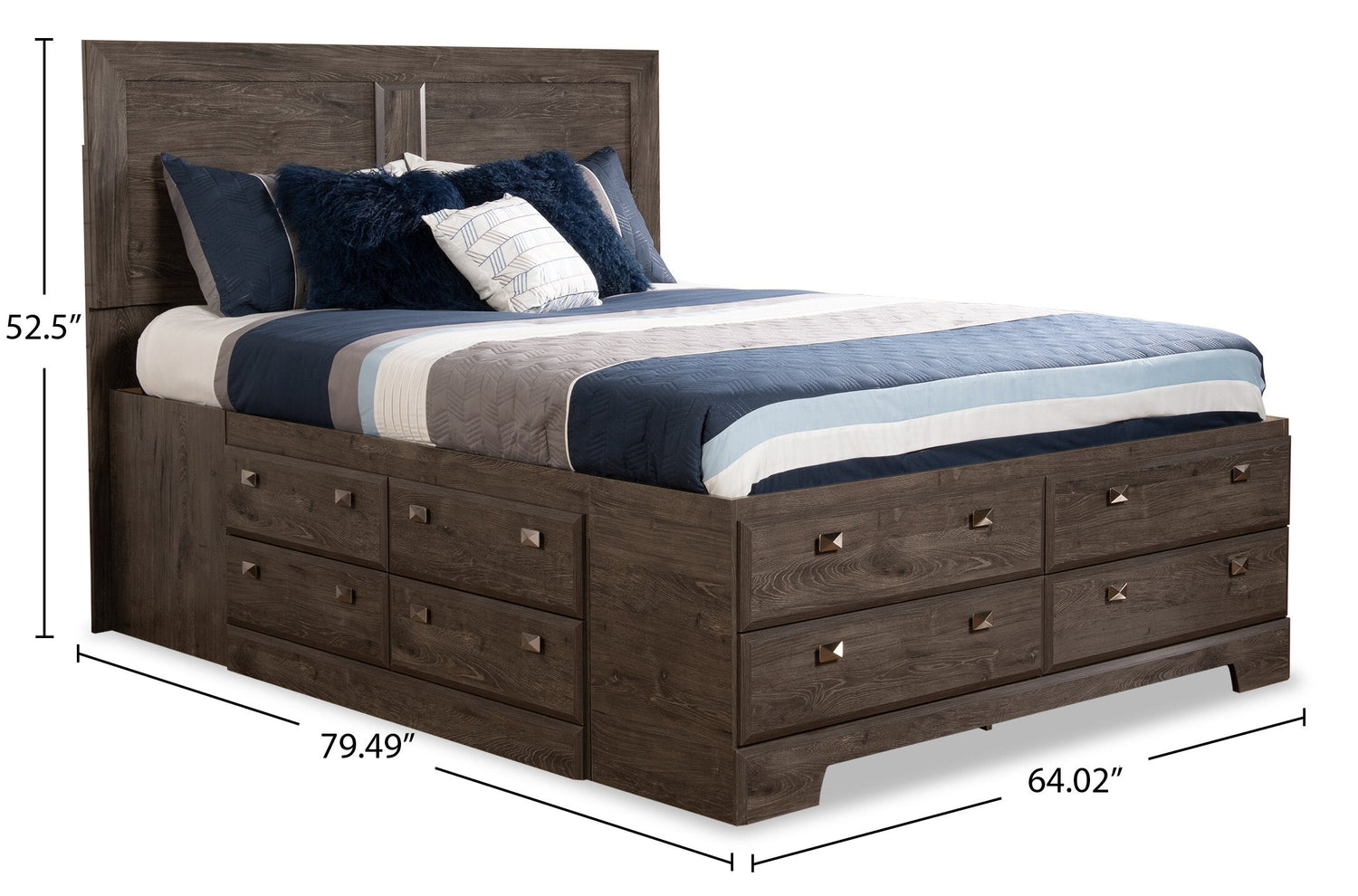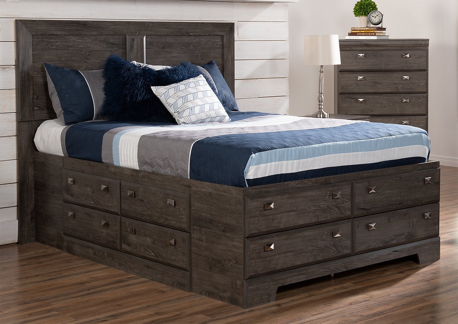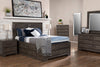 Embrace the feeling of contemporary style with the Yorkdale grey full storage bed. A soft grey finish made from engineered alabaster oak wood creates a neutral base to pair perfectly with almost any room decor. A sleek, tall headboard features a simple two-panel design that lets the alabaster oak finish colour shine through. Built into the lower half of the bed are a dozen drawers to help you keep extra blankets or pyjamas close at hand. Let the sleek, modern design of the Yorkdale grey bed help you build the perfect space for rest and relaxation.