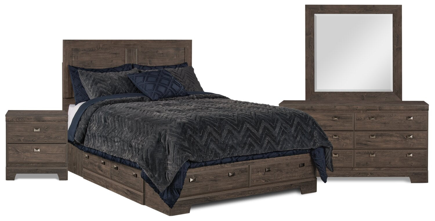 Embrace the feeling of contemporary style with the Yorkdale grey full six-piece storage bedroom package. The soft grey finish made from engineered wood creates a neutral base to pair perfectly with almost any room decor. Six drawers built into the lower half of the bed help you keep extra blankets or pyjamas close at hand. Rectangular pewter drawer pulls and a large square mirror add a burst of sparkle to the ample amount of storage space. Let the sleek, modern design of the Yorkdale grey bedroom help you build the perfect space for rest and relaxation.